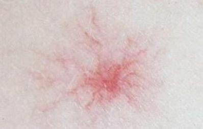 常見於面部、頸部或前胸出現中心紅點,周圍有輻射狀血管,形如蜘蛛,用手按壓中心點會暫時消失。